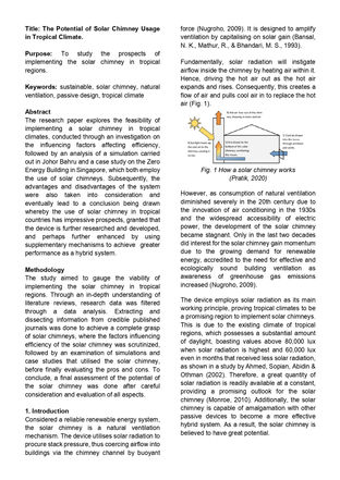 Our group was given the opportunity to carry out in-depth and thorough research on the solar chimney as a passive design. Our main goal of this research is to find out whether solar chimney is suitable to be utilised and applied in tropical climate environments and if not, what can we do to improve the performance of it. After numerous findings, we were able to conclude that solar chimney is an obscure device especially in tropical climates due to the 20th century technology inventions. However we obtained that its performance is inadequate as an individual but once supported with other devices, it works great. Overall we concluded it by acknowledging the lack of physical studies and precedents, how it works better as a hybrid system, and it is in fact suitable to be applied in tropical climate.